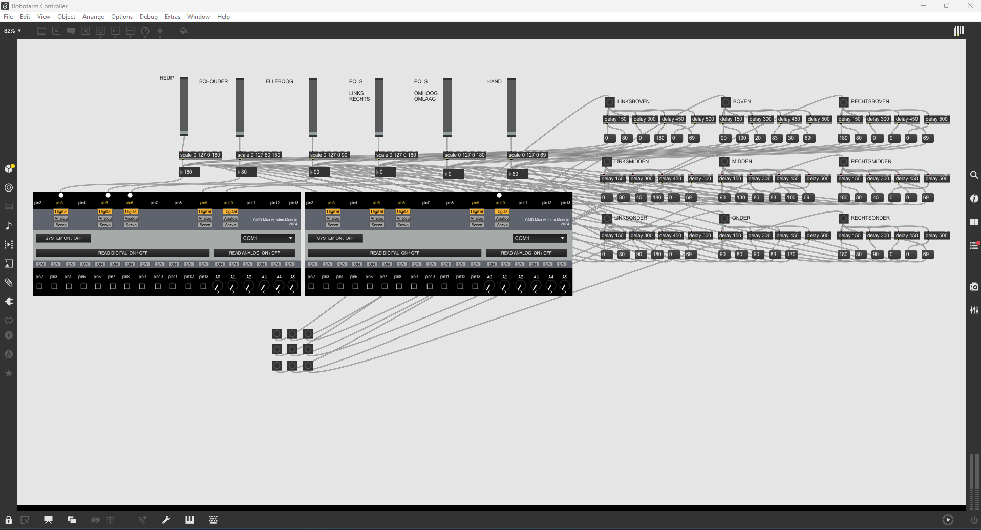 During my studies, I worked on a project centered around designing an interactive experience. For this project, I chose to program a fully autonomous robotic arm using Max/MSP, exploring how software, hardware, and interaction design could come together in a physical system.